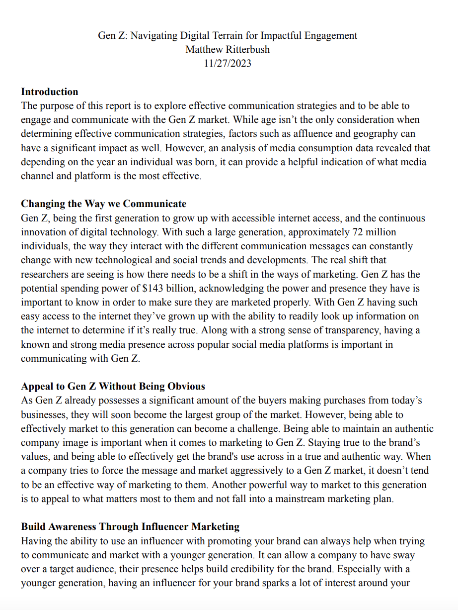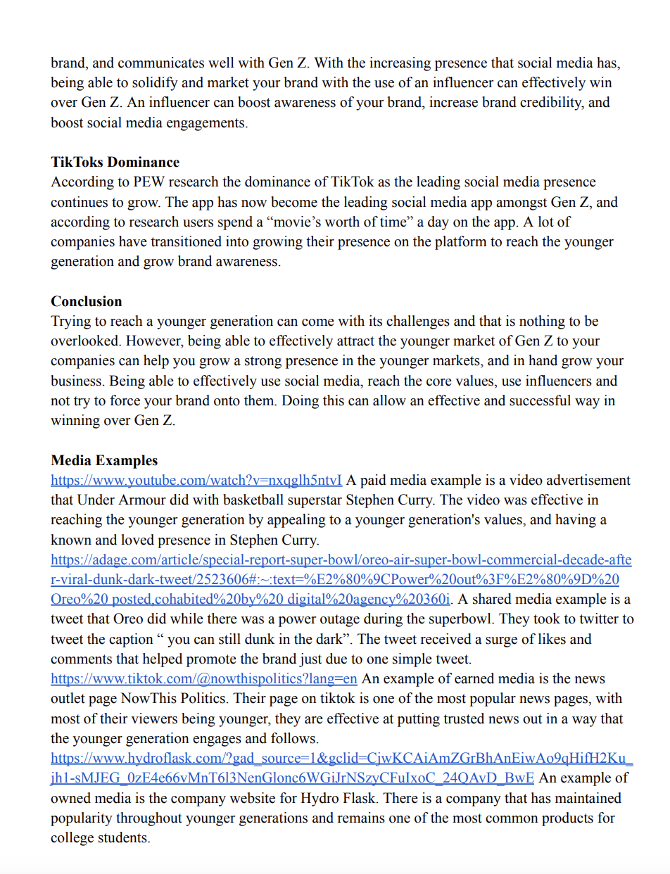 Here is a business report I wrote to help my clients navigate marketing to Gen Z. It offers a detailed guide and strategies to go about marketing, and some current media examples for them to look at for reference of some successful campaigns.