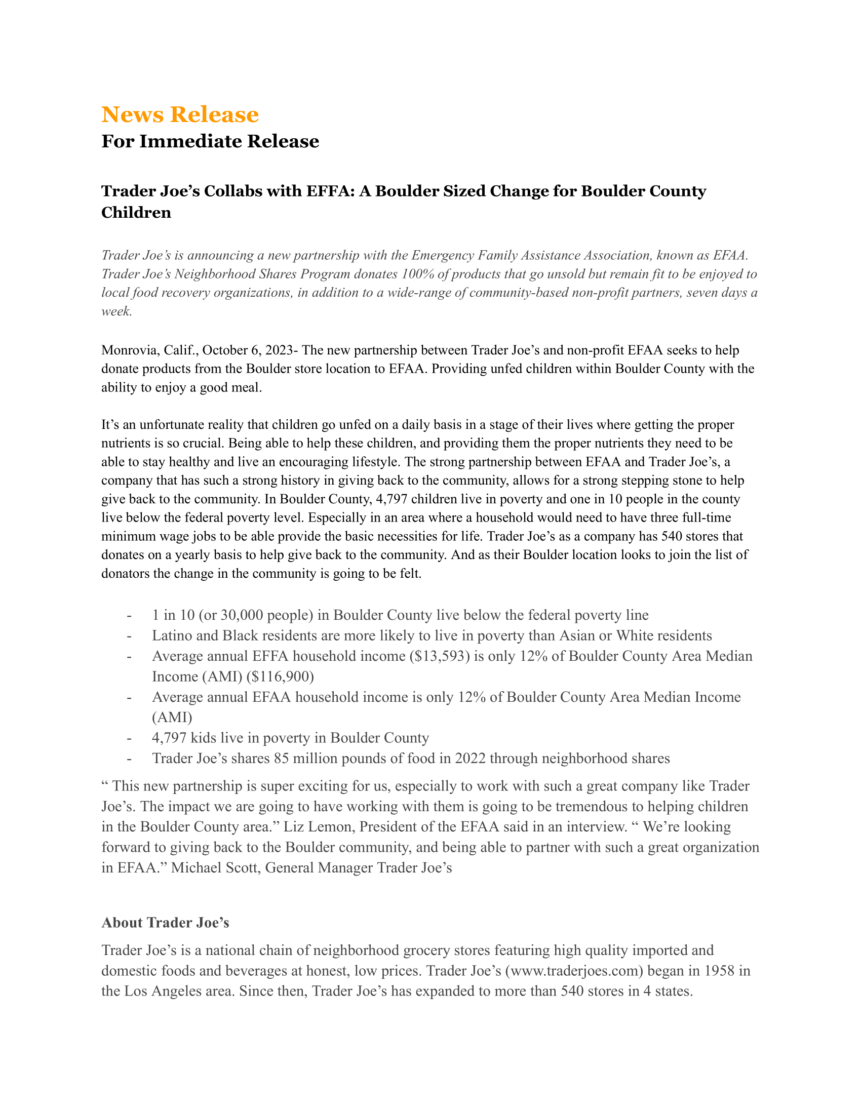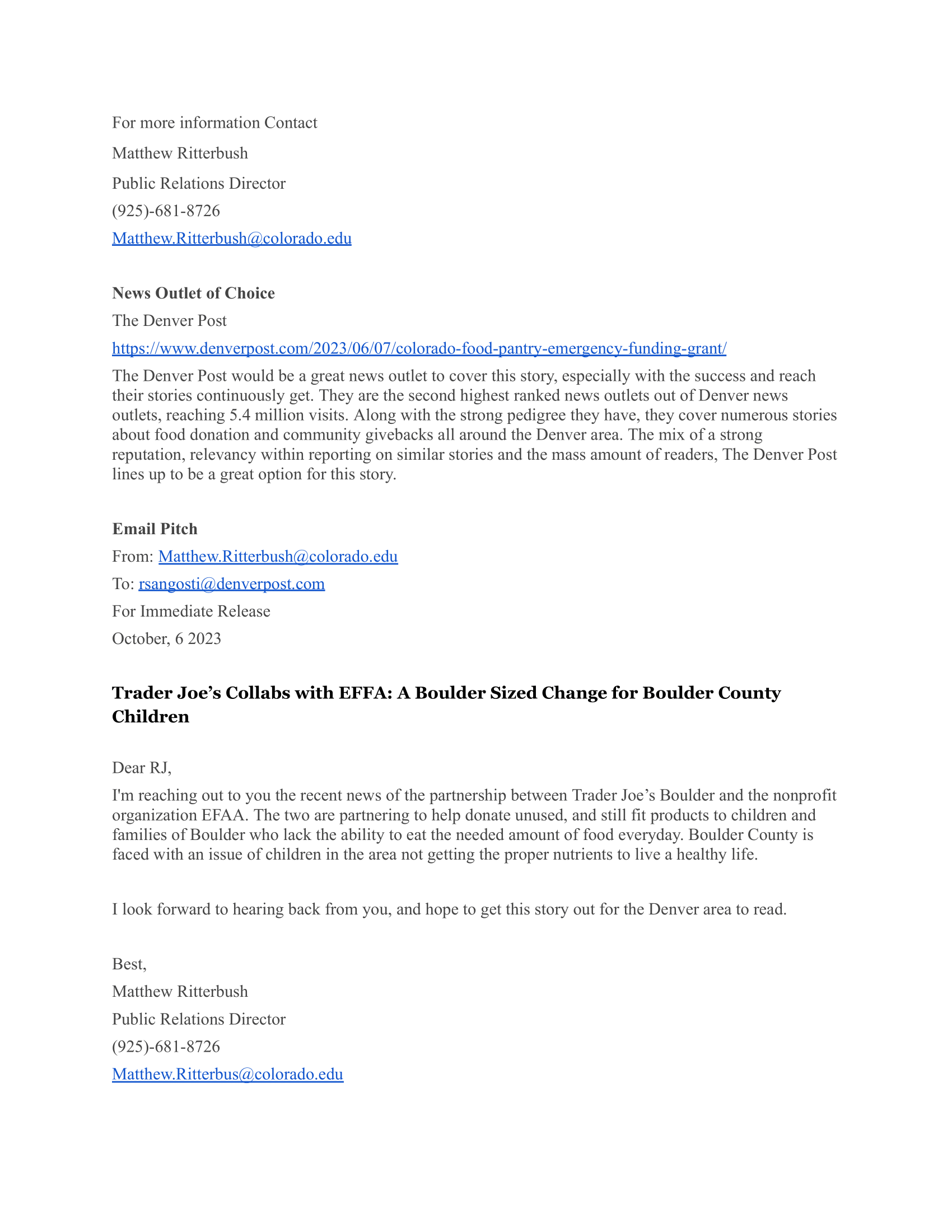Here is an example of a news relase that I wrote for Trader Joe’s and their partnership with EFFA. It is followed by a media pitch I wrote to the Denver Post in efforts to get the story out there.