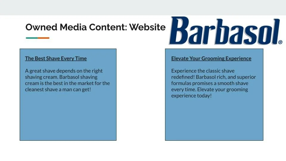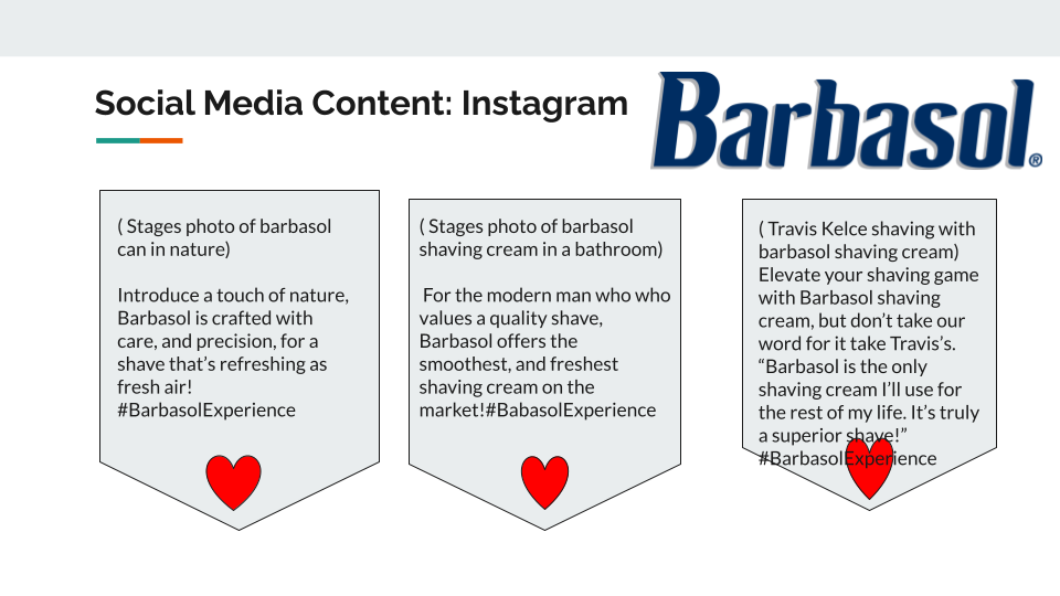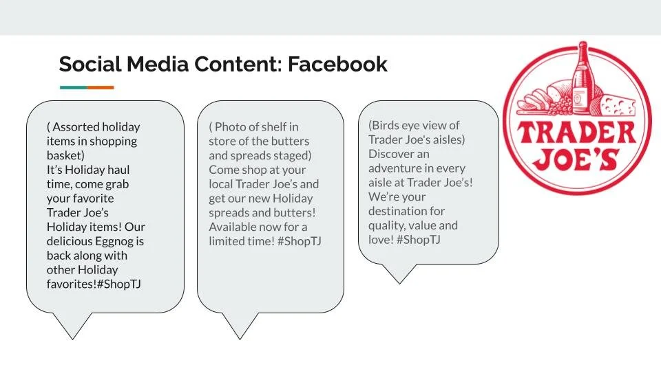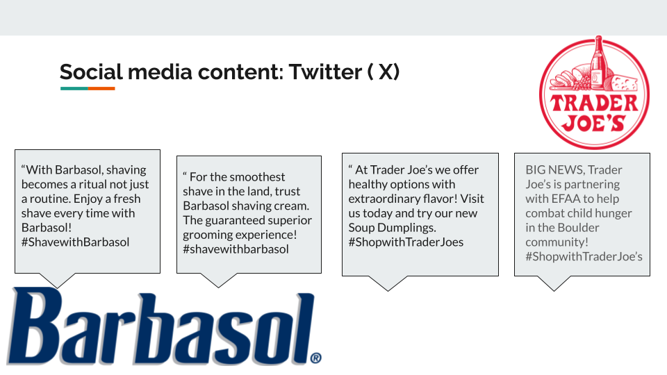 Here are some examples of social media and wesbite content I wrote for Barbasol and Trader Joe’s. Starting at the top left, I created some X(formally known as Twitter) posts. 2 for Barbasol and 2 for Trader Joe’s. Next in the top right are some Instagram posts for Barbasol, with descriptions of the ideal images used for each post. In the bottom left are some facebook posts for Trader Joe’s. Lastly, in the bottom right are some website content for Barbasol.
